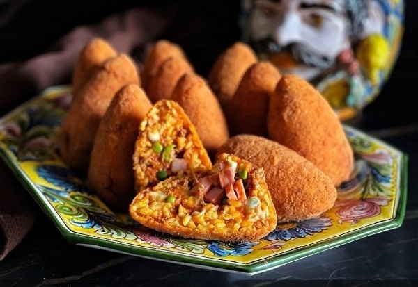 Arancini are crispy fried rice balls with a golden crust and a soft, flavorful filling, typically stuffed with ragu (meat